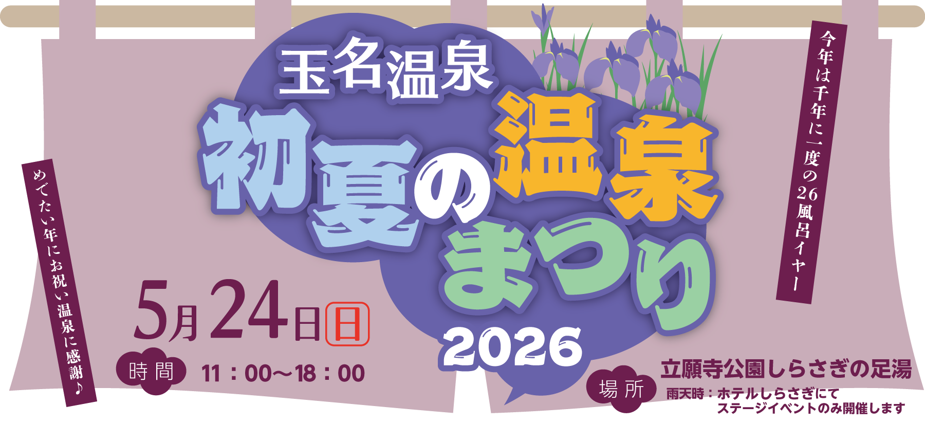 高瀬裏川花しょうぶまつり開催中の玉名で、「玉名温泉まつり」を開催します。今年は1000年に一度の「26(風呂)イヤー」。この記念すべき一年に合わせ、”温泉”を存分に楽しみ、感謝を伝えるイベントとなります。高瀬花しょうぶを楽しみながら、玉名の魅力を満喫しましょう。